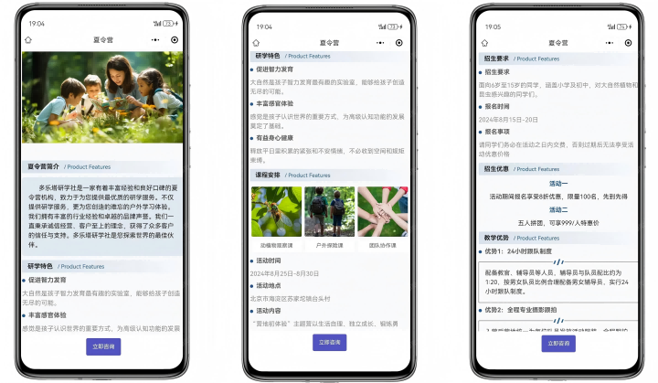 例如,针对亲子类、军事主题、自然探索等不同类型的夏令营,小程序可通过图文和视频形式展示课程内容、行程安排、师资团队、营地环境等,帮助家长全面了解活动特色,提升转化率。